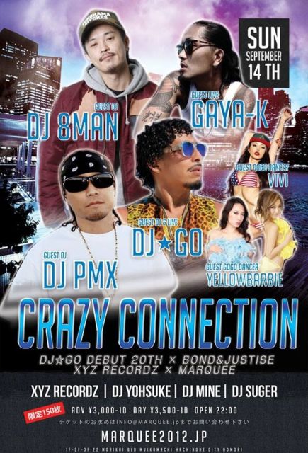 CRAZY CONNECTION -DJ☆GO”SUPERIOR BLUE”REALEASE PARTY- DJ☆GO DEBUT 20th × BOND&JUSTISE × XYZ RECORDZ × MARQUEE 2014.9.14.(SUN) @MARQUEE ■OPEN:22:00〜LAST ■ADV : \3,000/1D 限定150枚 DAY : \3,500/1D ■SP GUEST DJ&LIVE DJ☆GO ■SP GUEST DJ DJ PMX DJ 8MAN ■SP GUEST LIVE GAYA-K ■Guest Dj DJ SUGER ■DJ XYZ RECORDZ DJ YOHSUKE DJ MINE さて、今回のクレコネは 超豪華GUESTをお呼びしての BOND&JUSTISE MARQUEE とのコラボイベント 超豪華GUESTには 今年20周年を迎え、その
