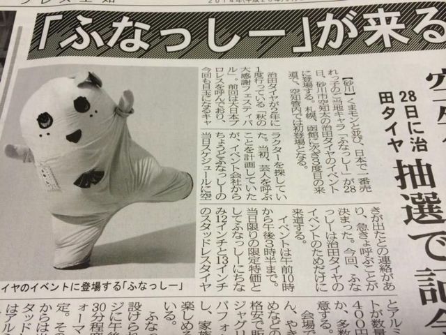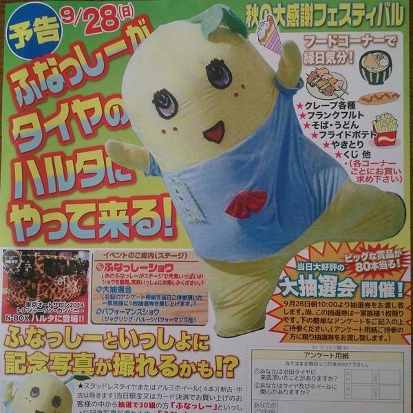 治田タイヤ「秋の大感謝フェスティバル」 ふなっしーがタイヤのハルタにやってくる 2014年9月28日(日) コメリパワー砂川店第2駐車場 砂川市空知太東1条2丁目376-3 ※駐車場収容台数325台、午前6時30分から利用可 スタッドレスタイヤ早期予約・在庫特価セールを開催! 当日ご購入のお客様の中から抽選で30名様にふなっしーと記念撮影会が当たる! 詳細は当日の折込チラシ参照とのこと
