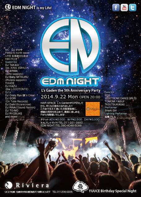 管理人様、告知失礼致します。 今度のEDM NIGHTは北海道最大級CLUB・Riviera sapporoで初開催! レーザービーム飛び交う空間! 炸裂するCO2(炭酸ガス)キャノン砲! 現出するエレクトロニックなダンスパフォーマンス! 突き抜ける最先端を目指すそのミュージック! これぞ!EDM! 世界同時進行系EDMイベント! 【9/22(Mon) EDM NIGHT (ELECTRONIC DANCE MUSIC)】 -L's Garden the 5th Anniversary Party- ■日時 2014年9月22日(祝前) OPEN/START 20:00 ■料金 ADV (前売り) ¥2,000 W/F (フライヤー持