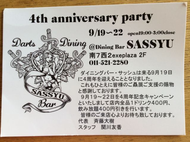 私事ですが、すすきので経営させて頂いてる BAR SASSYUが今週で4周年を迎えることとなりました そもそも、今から七年半前、サラリーマン時代に 『札酒会』を立ち上げ、飲み会やイベントなどを開催し お酒好きの夢であったBAR経営を四年前に始めました これもmixiから始まり、今に至ってる訳で お店に遊びに来て頂いた札酒会メンバーの方には感謝しておりますm(__)m 日頃の感謝を込めまして9/19〜9/21の3日間 4周年記念イベントを開催したいと思いますので いつも遊びに来て頂いてる方から、そういえば久しく顔出してないな