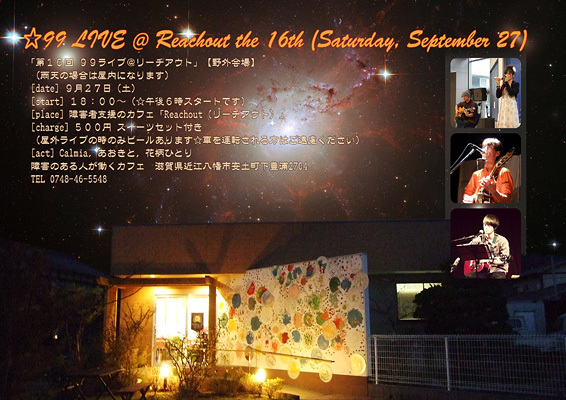 ¡ù99 LIVE @ Reachout the 16th (Saturday, September 27) ¡ÖÂ裱£¶²ó £¹£¹¥é¥¤¥Ö¡÷¥ê¡¼¥Á¥¢¥¦¥È¡×¡ÚÌî³°²ñ¾ì¡Û ¡Ê±«Å·¤Î¾ì¹ç¤Ï²°Æâ¤Ë¤Ê¤ê¤Þ¤¹¡Ë [date] £¹·î£²£·Æü (ÅÚ) [start] £±£¸¡§£°£°¡Á¡Ê¡ù¸á¸å£¶»þ¥¹¥¿¡¼¥È¤Ç¤¹¡Ë [place] ¾ã³²¼Ô»Ù±ç¤Î¥«¥Õ¥§¡ÖReachout¡Ê¥ê¡¼¥Á¥¢¥¦¥È¡Ë¡× [charge] £µ£°£°±ß ¥¹¥¤¡¼¥Ä¥»¥Ã¥ÈÉÕ¤ ¡Ê²°³°¥é¥¤¥Ö¤Î»þ¤Î¤ß¥Ó¡¼¥ë¤¢¤ê¤Þ¤¹¡ù¼Ö¤ò±¿Å¾¤µ¤ì¤ëÊý¤Ï¤´±óθ¤¯¤À¤µ¤¤¡Ë [act] Calmia¡¤¤¢¤ª¤¤È¡¤²ÖÊÁ¤Ò¤È¤ê ²ñ¾ì¡ÊGoogle¥Þ¥Ã¥×¡Ë ¢ª http://goo.gl/maps/fVQ8c ¾ÜºÙ¤Ï ¢ª http://99live.jp ·ÈÂÓ¡¦¥¹¥Þ¥Û¤ÎÊý