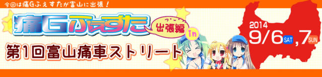 このコニュニティのイベントトピックはイベントのエントリー応募ではなく、「参加表明・交流」のためのトピックです。募集期限が設定されていますが、エントリー募集とは関係ありませんのでご注意下さい。 http://ita-g.jp/event/2014_toyama/ イベント名 痛Gふぇすた出張編in第1回富山痛車ストリート 開催地 第1回富山痛車ストリート内特設会場(中央通りアーケード) 主催 コンテンツクリエイトジャパン株式会社 痛車展示ゾーン運営 痛車グラフィックス (株)芸文社 会期 2014年9月6日(土)、7日(日) ※入替制。両日エ