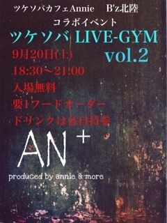 前回大好評のうちに幕を閉じたツケソバジム、第2弾始動! 【日時】 9月20日(土) 17:00〜21:00終了予定(画像と時間が異なるので注意!) 【場所】 富山県 高岡市 つけそばcafe Annie 詳細 http://r.gnavi.co.jp/90d9twys0000/ 【参加費】 お店にて1フード注文のみでOkayです。(つけそば、つけめん等麺類になります) ドリンク、お菓子等持ち込み自由! 【募集定員】 15名 【スケジュール】 17:00〜 開場 17:30〜 開演 B'z LIVE-GYM 2003 Final Pleasure “IT'S SHOWTIME!!”in 渚園 20:30〜終