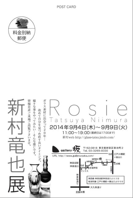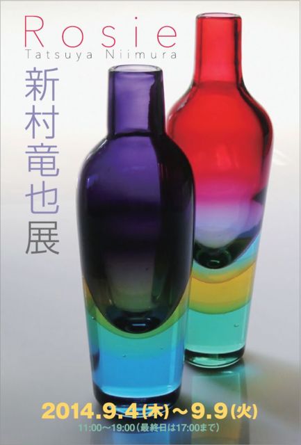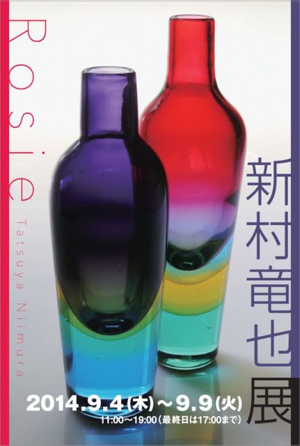 吹きガラス作家新村竜也の個展です。 皆様是非ご来場ご高覧下さいませ。 2014 9/4(木)〜9/9(火) 11:00〜19:00(最終日は17:00まで) ギャラリー坂 〒162-0818 東京都新宿区築地町2 03-3269-8330 東西線 神楽坂駅神楽坂口より3分 有楽町線 江戸川橋駅4番出口より6分 新村竜也 http://glass-tatsu.jimdo.com/