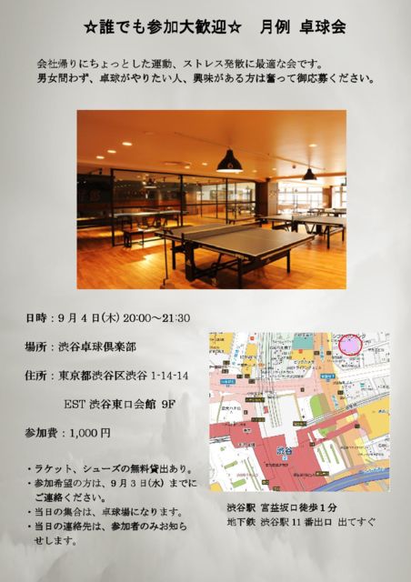 会社帰りにちょっとした運動、ストレス発散に最適な会です。 男女問わず、卓球がやりたい人、興味がある方は奮って御応募ください。 日時:9月4日(木) 20:00〜21:30 場所:渋谷卓球倶楽部 住所:東京都渋谷区渋谷1-14-14 EST渋谷東口会館 9F 渋谷駅 宮益坂口徒歩1分 地下鉄 渋谷駅11番出口 出てすぐ 参加費:1,000円 ・ラケット、シューズの無料貸出あり。 ・参加希望の方は、9月3日(水) までにご連絡ください。 ・当日の集合は、卓球場になります。 ・当日の連絡先は、参加者のみお知らせします。