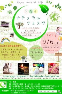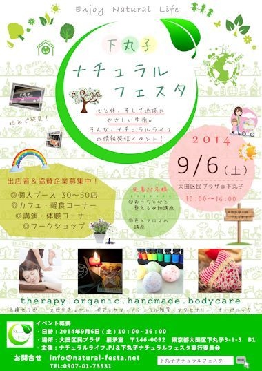 コミュの皆さま、 いつもお世話になっていますつるみです。 貴重なスペースをお借りしてご紹介させて下さい :::::::::: 大田区下丸子にて開催されます 生活を楽しむイベントが始まります! 9/6 (土) 10:00〜16:00 【下丸子☆ナチュラルフェスタ】入場無料 http://natural-festa.net/ 自分の心と体、そして地球にやさしい生活♪ そんなナチュラルライフを発信するイベントです! 地域のナチュラルライフの情報発信と活動PRの場へ、 あなたにピッタリのナチュラルライフ