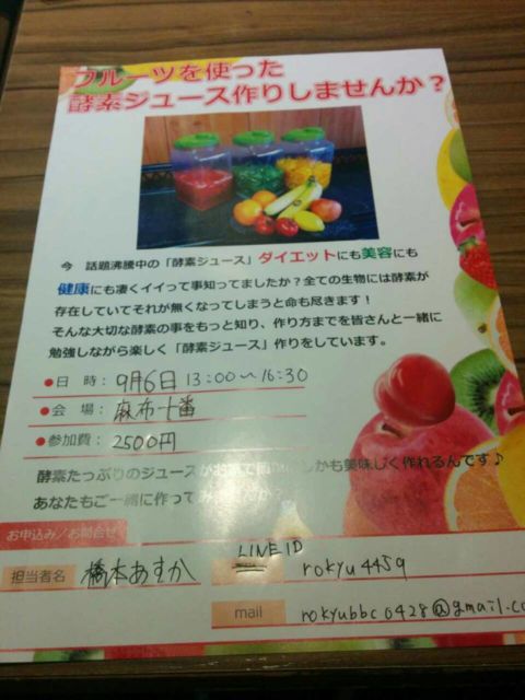 9月6日13時-16時まで、麻布十番にて、今話題の酵素ジュース会を開催します ★費用 2500円 容器や果物など全て込みの料金です。 今回の果物は、桃かブドウを予定しています。 ★当日持参するもの マイ包丁 エプロン(必要な方) 持ち帰り袋(2キロに耐えられるくらいの袋) 簡単な試食などもあり、とても人気の教室になっています。 酵素は体に必要な栄養素です。 これがないと体の消化吸収が機能しません 現代の人達はこれがうまく働いていないと言われています。 そこで、自分達で生きてる酵素ジュースを