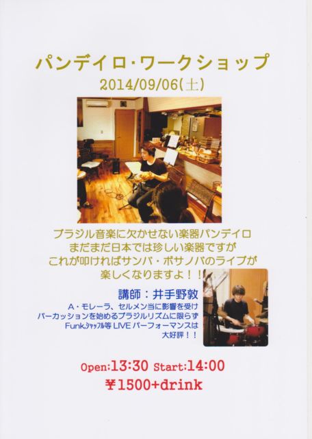 6日(土)昼 パンデイロワークショップ 講師:井手野敦(貸しパンデイロは要予約) Open;13:30 Start;14:00 〜16:00 ¥1500+drink