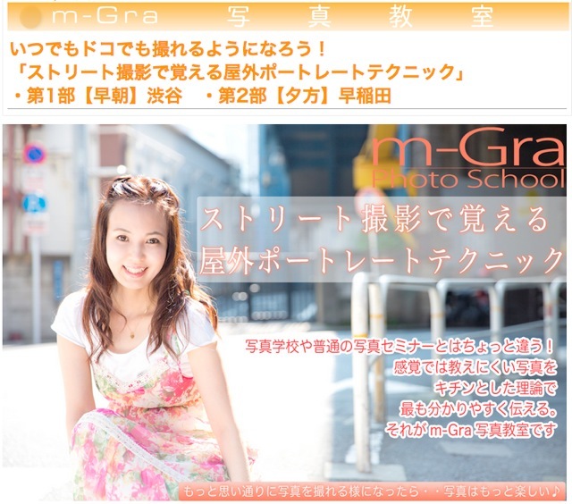 2014_9/6(土) いつでもドコでも撮れるようになろう! 「ストリート撮影で覚える屋外ポートレートテクニック」 ・第1部【早朝】渋谷 朝)スッキリした爽やかな光で撮影したい! ・第2部【夕方】早稲田 優しく柔かな光で撮影したい! ・ 場所の選び方 ・ 光の選び方 光の作り方 ・ 雰囲気や空気感の選び方 作り方 ・ ポージング指示 ・ 以上に伴うカメラの設定操作など 楽しく撮り歩きながらレベルアップできる写真教室です♪ お申し込みはこちら↓ http://m-koji.com/2014a/photoschool/140906.html