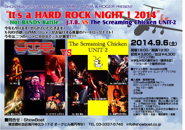 2014/9/6 @高円寺ショーボートでライブがあります☆ のまぐちひろしさんがご出演されます! ShowBoat 21st Anniversary AKIRA,OZMA&ROGER present “It`s a HARD ROCK NIGHT ! 2014” 〜Hot BANDS Battle〜 今年もやります!やらせていただきます! X-RAYの朗、OZMA、ロジャーがお届けする真夏のハードロックナイト! 今年は二つのバントに分かれて三人が激突!!! J.T.B.(Journey Tribute Band) vs The Screaming Chicken UNIT-2 ※J.T.B. [藤本朗(vo/Steve Perry)/早川入(g/Neal schon) のまぐちひろし(b/Ross Valory