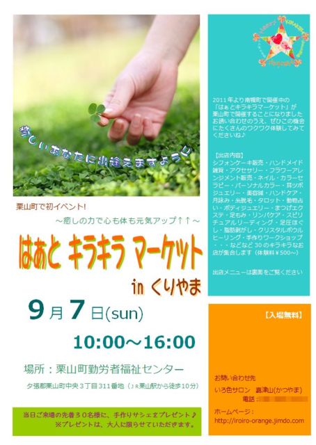こんにちは 管理人様、スペースお借り致します。 コミュのみなさま、ご覧いただきありがとうございます。 栗山町のお隣、南幌町でカラーサロン「いろ色サロン」をOPENしている、かつやまです。 南幌町でお母さん達のための楽しいイベントを開催したいと、はぁとキラキラマーケットを立ち上げ栗山町からも今までたくさんの方のご来場ありがとうございました。 今回は、栗山町で初開催させていただきます!! スピリチュアル系、美容系、ボディ系、手作りワークショップ、スイーツ販売など、 30のお店が 栗山に集合します