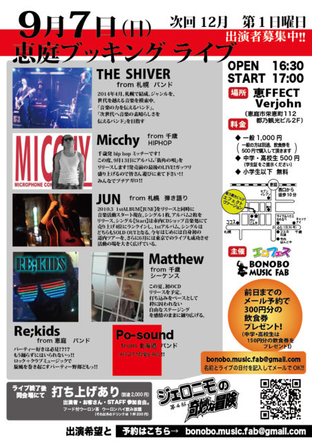 いつも心に音楽を。息抜きにライブどおですか!? ライブ企画しました!! 恵庭近郊で音楽好きな方、ぜひ気軽に! ※予約特典有ります。 9月7日(日)OPEN 16:30 START 17:00 @恵FFECT Verjohn (恵庭市栄恵町112 都乃観光ビル2F) 一般:1,000円(別途、500円分の飲食券購入) 中学・高校生:500円(学生証提示) 小学生以下:無料 ☆Matthew(シーケンス) ☆Miccchy(ヒップホップ) ☆Po-sound(バンド) ☆Re;Kids(バンド) ☆THE SHIVER(バンド) ☆JUN(弾き語り) ※事前に、ご予約されたお客様に、300円分の