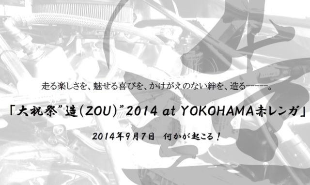 大祝祭”造(ZOU)2014atYOKOHAMA赤レンガ 2014.9.7(日) スーパーカー・アメ車・旧車!自慢の車が横浜赤レンガに 大集合〜のイベントです!ライブステージでも盛り上がっちゃいましょう! 交流あり、観光あり、盛りだくさんのイベントです。 ぜひご参加お待ちしております。 http://autogarage.tv/zou/perfomer/zou_perfomer01.html 出演者 COOLS・秀光 白倉ヒサオ(永ちゃんマン) 原めぐみ ママ&シューカ Tokyo Funky5 郷嵐曾 ビリー諸川 CONNY & DUCKIES FREEMYNZ ドクター松岡 井上直美
