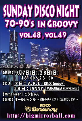 今月は第1日曜&第4日曜に開催となります【SUNDAY DISCO NIGHT】 日曜日にしかお出かけできない方々など、休日でもDISCOなNIGHTを存分にお楽しみいただけます(^_-)-☆♬ 【DJ】A.K.I. 【音楽】オールジャンル (SOUL、竹の子、EURO、HI-NRG、R&B、etc... 皆様のリクエストにお応えします!) 【開催時間】18:00〜23:00 【料金】 男性:¥2,500/2Drinks+ビュッフェ付 女性:¥2,000/2Drinks+ビュッフェ付 (ビュッフェは18時よりご用意しますが数量限定につき無くなり次第終了となります) 【オーガナイザー】こう