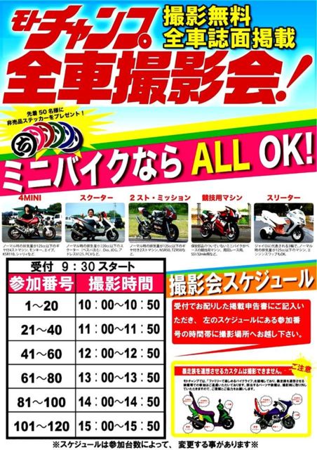 無料 モトチャンプ全車撮影会に行ってみませんか!? ベースマシンが原付2種までのミニバイクなら、ノーマルからレース用マシンまで撮影会に参加出来ちゃいます! ただ暴走族を連想させる車両はNG撮影できません。。。 イベント会場までプチツーを企画します〜 まだまだ暑さも厳しいですが お暇あり、興味ある方は参加お待ちしております!! 友達・家族も誘って全然OKです! 車種も問いません 集合場所:ナップス横浜店 集合時間:午前9時 出発時間:午前9時過ぎ ドタキャン・ドタ参加・現地集合・他コミュ宣伝
