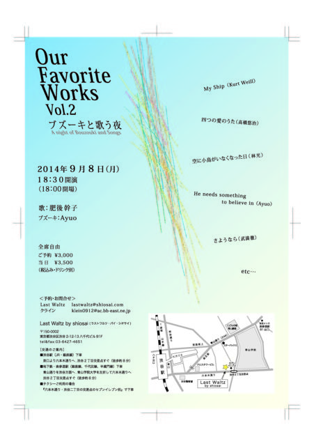 9月では2回渋谷のLast Waltzに出演します。 まず、9月8日にはドイツ・リートを専門とするソプラノ歌手、肥後 幹子さんのブズーキ伴奏者として出ます。 コンサート・タイトルは『ブズーキと歌う夜』。 今回はギリシャのブズーキとアイルランドのブズーキで伴奏します。 自分のコンサートではないので、自分は歌いません。 コンサートの半分位は武満徹の歌曲集から編曲したものです。 また、林光、シューベルト、ウエーバー、クルト・ワイル等の曲も演奏します。 ブズーキでこうした曲が伴奏される事は珍しい事です。 僕もこうした事を他の人が