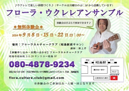 こんにちは、フローラカルチャークラブです♪ 9月8日・15日・22日にウクレレの無料体験会を行います! 時間は13:00〜です。 体験用楽器はこちらでご用意しますので、手ぶらで参加できますよ♪ 参加ご希望の方は前日までにご予約ください! 【ご予約・お問い合わせ】フローラカルチャークラブ 昭島市昭和町5-6-20サンリコー昭島3F(昭島駅南口・徒歩1分) 080-4878-9234 flora.culture.club♪gmail.com(♪を@に変換してください)