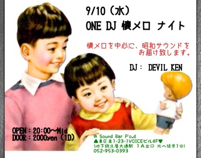 先行告知! …━━*━━+☆ ONE DJ懐メロ ナイト ☆+*━━━━━…━… ■ 9/10(水) ■ PM8:00 スタート ■ SOUND BAR P,o,d ■ DJ DEVIL KEN ■ 料金 ・\2000(1D) ☆ 懐メロを中心に、 昭和サウンドを お届け致します。 ☆ 最近の曲は あんまり知らないけど、 昔の曲なら 知ってるという そこの"あなた! ☆ やっぱり昔の曲は い〜よな〜って 思っている、あなた! ☆ DJのDEVIL KENが 1人でお届けする 日本の懐メロ ナイト あんな曲や こんな曲! 果たしてどうなるこ