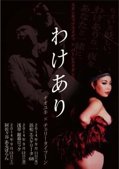 2014/9/11(木) 開場 18:00 / 開演 19:00 予約 2000円 / 当日2500 円(共に1ドリンク別) 出演:ナオユキ、チェリータイフーン スタンダップコメディ×バーレスクダンス。 ちょいと妖しい、わけありな一夜をあなたと一緒に。 <ナオユキ> 大阪府大阪市出身。松竹芸能所属。 漫才コンビ"ダックスープ"を解散後、ピン芸人として舞台・テレビにて活動。 一人で淡々と思いを語るスタイルのネタで、ライブハウスなどでイベントも開催。 活動の領域は幅広く、「STAND UP COMIC」という演目で海外公演も経験。 R-1ぐらんぷり2011ファイナリ
