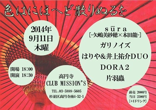 http://www.live-missions.com/schedule.html?ym=2014-09 色はにほへど散りぬるを 【ROCK/ART】 ACT sura -矢嶋美紗穂×本田龍- ガリノイズ はりや&井上祐介DUO DORA2 片羽蟲 OPEN 18:00 START 18:30 CHARGE ADV \2,000 / DOOR \2,500 + 1drink(\500)
