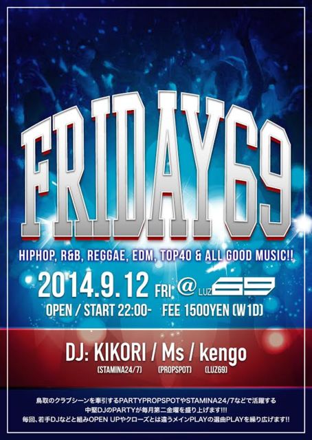 鳥取のクラブシーンを牽引するPARTY PROPSPOTやSTAMINA24/7などで活躍する 中堅DJのPARTYが毎月第二金曜を盛り上げます!!! 毎回、若手DJなどと組みOPEN UPやクローズとは違うメインPLAYの選曲PLAYを繰り広げます!! 『FRIDAY69』 [HIPHOP , R&B , REGGAE . EDM . TOP40 & ALL GOOD MUSIC!! ] ■2014.9.12 fri ■OPEN / START 22:00- ■@LUZ69 ■DJ KIKORI (STAMINA24/7) Ms (PROPSPOT) kengo (LUZ69) and・・・more ■fee 1500yen (W1D)