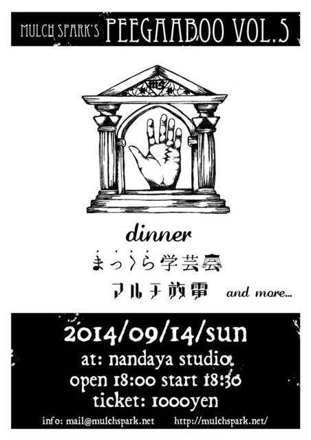 『マルチ放電のPeegaaboo…!!! vol.5』 2014.9.14(日)なんだ屋スタジオ open 18:00 start 18:30 入場料1,000円(学生前売りのみ \500) -act- マルチ放電 まっくら学芸会 dinner distwilights