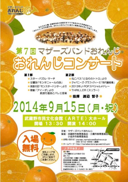 突然の書き込み失礼致します。 私共は、武蔵野・三鷹地区を中心に活動しております吹奏楽団、マザーズバンドおれんじと申します。 このたび、第7回おれんじコンサートを開催することになりましたので、 この場をお借りしてご案内させていただきます。 ♪ ・ ♪ ・ ♪ ・ ♪ ・ ♪ ・ ♪ ・ ♪ ・ ♪・ ♪ ・ ♪ マザーズバンドおれんじ 「第7回おれんじコンサート」 ◆日時:2014年9月15日(月・祝) 開場13:30 開演14:00 ◆場所: 武蔵野市民文化会館(ARTE)大ホール <アクセス> 電車:JR中央線三鷹