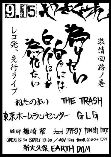 やさぐれレコ発CD先行発売「為りたい自分には自分にしか為れない」激情回路ノ巻 日程:9月15日(月/敬老の日) 開場18:30開演19:00 会場:新大久保EARTH DOM (03)3205-4469 新宿区大久保2-32-3 リスボンビルB1 http://www1.odn.ne.jp/shinjuku-dom/index.html/dom.html 出演:東京ホームランセンター/やさぐれ /THE TRASH/ねたのよい/GLG 絵師: 楢崎 翠 Food : Chika 料金:前売¥1700当日¥2000(+ドリンク¥500)
