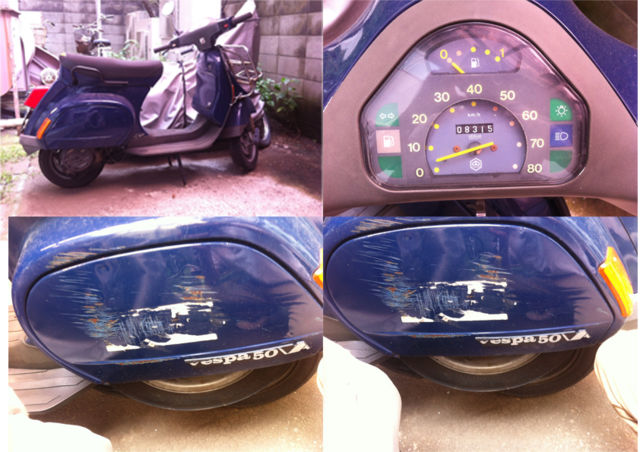 ・メーカー名: ・車名:ベスパ50A ・年式: ・車体番号: ・2st/4st:2st ・排気量: ・色:紺 ・自走: 可能 ・走行距離:8315キロ ・車検/自賠責の有無:無 ・事故歴:有り ・キズや不具合の有無:有 一度転倒したので左後ろにこすれキズがあります ライト割れてます ・カスタム箇所や装備:後ろタイヤパンクの為 スペアタイヤ着用 バッテリー新品(始動確認はしました) ・希望価格:5万円 ・分割払いの可否 (受け付けません/全額支払後の引渡しのみ可) ・支払方法 現金 ・出品地域 東京都墨田区 ・発