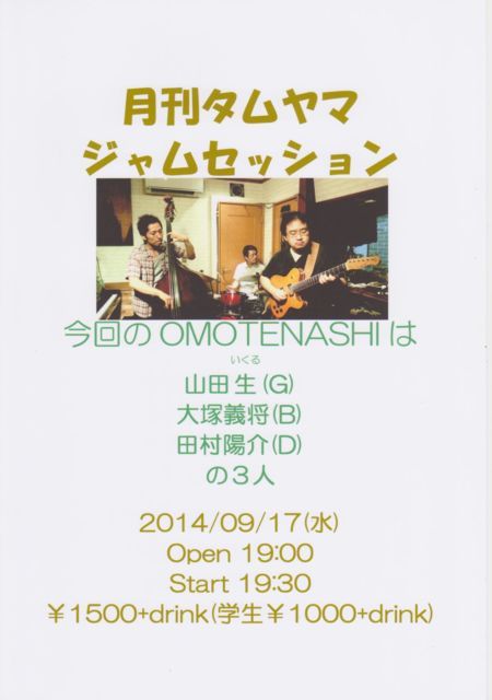17日(水)Jazz 月刊タムヤマJam Session 山田生(G) 大塚義将(B) 田村陽介(D) Open;19:00: Start;19:30 ¥1500+drink(学:¥1000+drink)