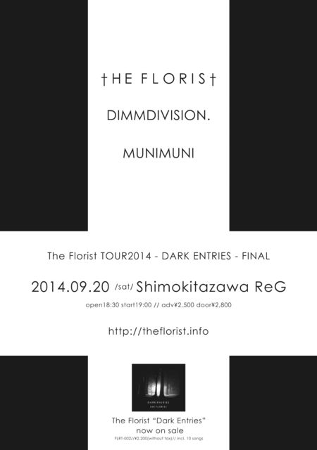 2014.09.20(sat) 東京 下北沢ReG The Florist TOUR2014 - DARK ENTRIES - FINAL open18:30 start19:00 adv\2,500 door\2,800 TICKET:7/5〜 イープラス、店頭 ※Eメールによるチケット前売予約も承っています。ホームページのCONTACTフォームから、またはtheflorist@outlook.comまで予約をご希望の日付・会場名・お名前・枚数をご連絡ください。 (入場順:イープラス→その他の購入) w/DIMMDIVISION.,MUNIMUNI info.下北沢ReG 03-6450-9346 http://theflorist.info