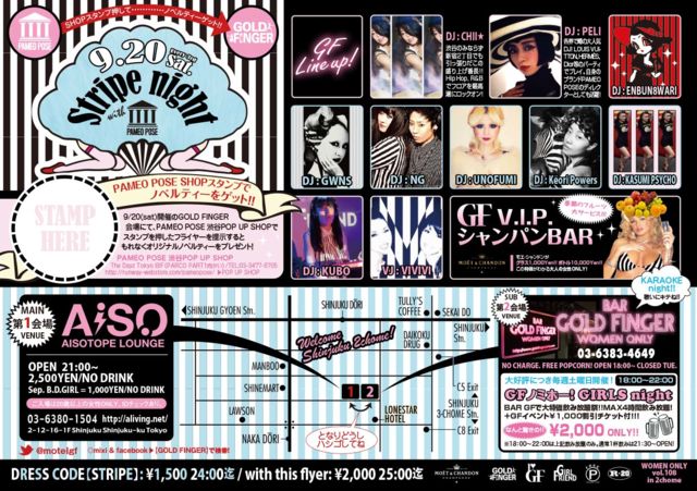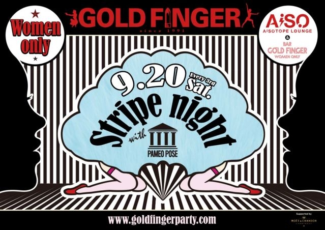 ★GFイベントはBAR GF隣【AiSOTOPE】で毎月第3土曜日開催!★ ≪GOLD FINGER≫ ★WOMEN ONLY★ http://www.goldfingerparty.com/ 9/20 SAT(every 3rd) Stripe Night with PAMEO POSE @AiSOTOPE LOUNGE Shinjuku 2chome OPEN 21:00~ 2,500Yen/No Drink DRESS CODE = 【STRIPE】 ADM.1,500Yen/No Drink before 24:00 with flyer = ADM.2,000Yen/No Drink before 25:00 Sep. B.D.GIRL = 1,000Yen/No Drink 【PAMEO POSE SHOPスタンプでノベルティーをゲット!】 9/20(Sat)開催のGOLD FINGER会場にて、 PAMEO POSE 渋谷POP UP