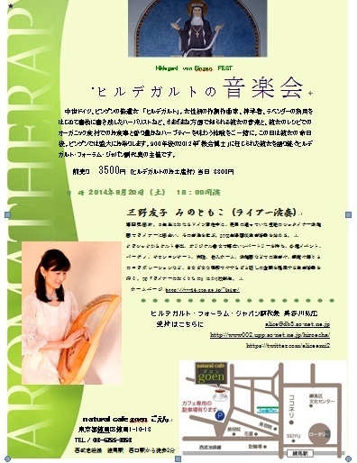 前売り 3500円 (ヒルデガルトのお土産付) 当日 3800円 中世ドイツ、ビンゲンの修道女 「ヒルデガルト」。女性初の作詞作曲家、神学者、ラベンダーの効用をはじめて書物に書き残したハーバリストなど、さまざまな方面で知られる彼女の音楽と、彼女のレシピでのオーガニック食材でのお食事と香り豊かなハーブティーを味わう体験をご一緒に。この日は彼女の命日後。ビンゲンでは盛大にお祭りします。(ライアー演奏) 三野友子さま 福岡県出身。8年半にわたるドイツ滞在中に、長男の通っていた現地のシュタイナー幼稚園でライアーに出会い