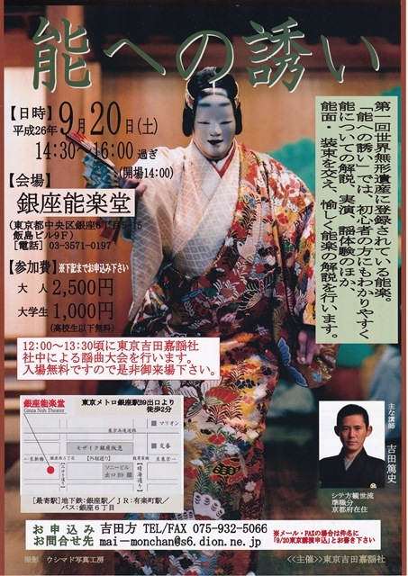 「能への誘い」(東京) 日時:平成26年9月20日(土)14:30 〜16:00過(開場14:00) 会場:銀座能楽堂 (東京都中央区銀座6丁目5-15飯島ビル9階 ※地下鉄銀座駅、JR有楽町駅より徒歩圏内 内容:第1回世界無形遺産に登録されている『能楽 』を、 話・舞・謡・体験・装束を交えて、初めて観る方にもわかりやすく愉しく講演。 また、12:00〜13:30頃にお弟子様方による謡曲会を、 入場無料で行っていますので、よかったら、こちらにもお越し下さいませ。 料金:大人2500円、大学生1000円 (※予約制、高校生以下無料) お問い合わせ、