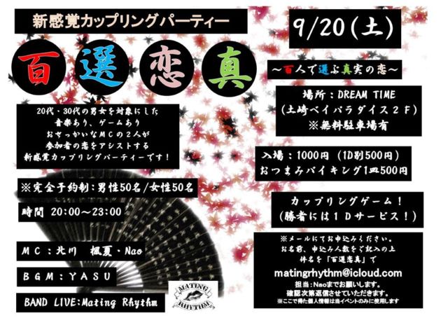 〜百人で選ぶ真実の恋〜 20代・30代の男女を対象にした 音楽あり!ゲームあり!! おせっかいなMCの2人が参加者の恋をアシストする 新感覚カップリングパーティーです! その場の空気を大事にしていきますよ〜! 素敵な出会いが訪れるようMCの2人が全力でサポートします! 気軽な参加お待ちしております! 場所 DREM TIME(土崎ベイパラダイス) ※無料駐車場有 時間 20:00 ~ 23:00 入場:1000円(1D別 500円) おつまみバイキング 1皿500円