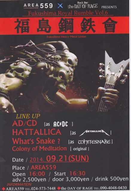 福島市でメタルライブイベントです。 トリビュートバンドやってる方や、興味のある方は見逃せないラインナップで開催されます。 福島県のみならず、隣県の山形、宮城からも是非足を運んでいただきたい。 チケットご希望の方は、コメ、メッセ等、よろしく! ちなみに「仙台⇔福島」のJRダブル切符なら往復で普通列車1.540円、新幹線4,620円です。 電車でも帰られるような時間で終了する予定です。 駐車場やお酒も飲めることを考えると列車や高速バスでの移動もいいかもね。 日時:2014.9.21(SUN) open 16:00 start 16:30