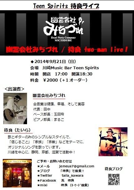 Âç¹¥¤¤Ê¥Ð¥ó¥É¡ÖÍ©Îî²ñ¼Ò¤ß¤Á¤Å¤ì¡×¤È¤Î¥Ä¡¼¥Þ¥ó¥é¥¤¥Ö¤Ç¤¹! ¤¢¤Ê¤¿¤â¤ß¤Á¤Å¤ì¤Ë¤Ê¤í¤¦¡ª ¡ù2014ǯ9·î21Æü¡ÊÆü¡Ë ¡ù³«¾ì¡¡17»þ00ʬ ¡¡¡¡¡¡ ¡¡¡¡ ¡¡ ³«±é¡¡18»þ30ʬ ¡ù¥Á¥±¥Ã¥È¡¡2000±ß¡Ü1¥ª¡¼¥À¡¼ ¡ù½Ð±é¡¡Í©Îî²ñ¼Ò¤ß¤Á¤Å¤ì¡¡ÂÔÎÉ ¡¡¢öÍ©Îî²ñ¼Ò¤ß¤Á¤Å¤ì£È£Ð ¡¡http://www.michidure.com/ ¡ù¾ì½ê¡¡Àîºê¡¡Music Bar Teen Spirits¡Ê¥ß¥å¡¼¥¸¥Ã¥¯¥Ð¡¼¥Æ¥£¡¼¥ó¥¹¥Ô¥ê¥Ã¥Ä¡Ë ¢©210-0005 ¿ÀÆàÀÀîºê»ÔÀîºê¶èÅìÅÄÄ®4-11 ¥¢¥Ã¥×¥ë¥Ó¥ë101 ÅÅÏÃÈÖ¹æ ¡¡044-200-8969 Music Bar Teen Spirits http://r.gnavi.co.jp/gd3d200/ ¢©210-