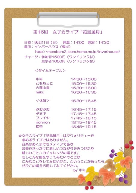 ¡ù9·î21Æü¡ÊÆü¡Ë ½÷»Ò²ñ¥é¥¤¥Ö¡Ö²ÖÄ»É÷·î¡× ¾ì½ê¡¡¥¤¥ó¥Ð¡¼¥Ï¥¦¥¹ ³«¾ì¡¡14:00¡¡³«±é¡¡14:30¡Ê»²²Ã¼Ô¤Ï13:00½¸¹ç¡Ë ¥Á¥ã¡¼¥¸¡¡»²²Ã¼Ô¡¡1500±ß¡Ê¥ï¥ó¥É¥ê¥ó¥¯ÉÕ¡Ë¡¡¸«³Ø¼Ô¡¡1000±ß¡Ê¥ï¥ó¥É¥ê¥ó¥¯ÉÕ¡Ë ¡ã½Ð±é¡ä¢¨½Ð±é½ç ¥¥ ¤È¤â¤Á¤ç¤³ ¸Å߷ͳµ® miku ¤ß¤ª¤ß¤ª ¥¿¥Ì¥ ¥Õ¥ì¥¤¥ä nonnon ϰÃã