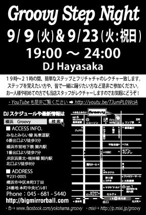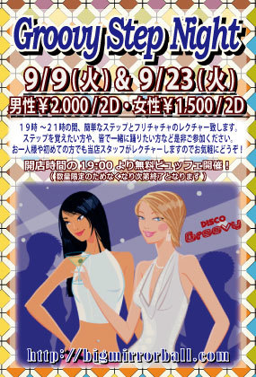 Âè2¡¦Âè4¤Î²ÐÍËÆü¤Ï¡ÚGroovy STEP NIGHT¡Û 19»þ¡Á21»þ°Ì¤Î´Ö¡¢´Êñ¤Ê¥¹¥Æ¥Ã¥×¤È¥Õ¥ê¥Á¥ã¥Á¥ã¤Î¥ì¥¯¥Á¥ã¡¼¤¢¤ê¤Þ¤¹¡ª ½é¿´¼Ô¤ÎÊý¡¢¤ª°ì¿ÍÍͤǤ⡢ÅöŹ¥¹¥¿¥Ã¥Õ¤¬¤´Âбþ¤µ¤»¤ÆÄº¤¤Þ¤¹¤Î¤Ç¤É¤¦¤¾¤ªµ¤·Ú¤Ë¤´»²²Ã¤¯¤À¤µ¤¤¢ö ¡ÚDJ¡ÛHayasaka ¡Ú²»³Ú¡ÛALL MIX ¡Ê21»þ°Ì¤«¤é¤ÏÄ̾ï¤ÎDISCO TIME¤Ë¤Ê¤ê¤Þ¤¹¡£¥ê¥¯¥¨¥¹¥È¤Ë¤â½ÐÍè¤ë¸Â¤ê¤ª±þ¤¨¤¤¤¿¤·¤Þ¤¹¤Î¤ÇDJ¤Þ¤Ç¤É¤¦¤¾¢ö ¡Ú³«ºÅ»þ´Ö¡Û 19:00¡Á24:00 ¡ÚÎÁ¶â¡Û ÃËÀ¡§¡ï2,000/2Drinks¡Ü¥Ó¥å¥Ã¥Õ¥§ ½÷À¡§¡ï1,500/2Drinks¡Ü¥Ó¥å¥Ã¥Õ¥§ ¡Ê¥Ó¥å¥Ã¥Õ¥§¤Ï19»þ¤è¤ê¤´ÍѰÕÃפ·¤Þ¤¹¤¬¿ôÎ̸ÂÄê