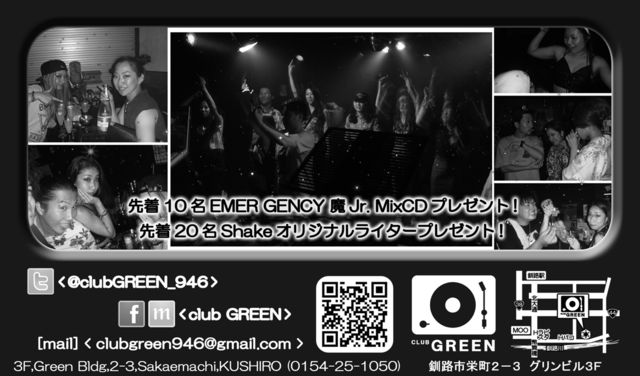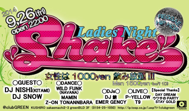 ♪HIP HOP/REGGAE <9/26(fri) OPEN 22:00> -Ladies Night- 【Shake】 **GUEST** DJ NISHI(KITAMI) DJ SNOW **DJs** DJ 鯖/EMER GENCY **LIVE** P-YELLOW/T9 **Dancers** WILD FUNK(NAVANA) Z-ON TONANNBARA MAMIN [MEN 1500yen(1D)] [Ladies 1000(FreeDrink)]