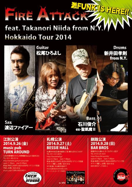 Fire Attack feat. 石川俊介&新井田孝則 全国ツアー2014のお知らせです。 北海道にも3カ所行きます(江別、札幌、釧路)。 なかなか北海道で観る事の出来ない 石川さんを目の前で観る事が出来ます!! 是非観にいらして下さい!! 秋の全国ツアーPVです。 http://www.youtube.com/watch?v=w558uogP8lM 渡辺ファイアー (Sax) 松尾ひろよし (Guitar) 石川俊介 (Bass) ex-聖飢魔ll 新井田孝則 (Drums) from N.Y. 江別公演 2014.9.26 (金) music pub ターンアラウンド 江別市野幌町59-8 (JR野幌駅北口より徒歩2分) T