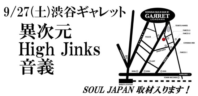 9/27(ÅÚ)½Â륮¥ã¥ì¥Ã¥È °Û¼¡¸µ¡ßHigh Jinks¡ß²»µÁ ¥¹¥Ú¥·¥ã¥ë¥³¥é¥Ü¥ì¡¼¥·¥ç¥ó SOULJAPAN¼èºàÆþ¤ê¤Þ¤¹ ¹âÌÚ¥µ¥¤¥É¥¹¥Æ¥Ã¥×¡õKAKUTA¡õ1-cho ¥Ð¡¼¥¹¥Ç¡¼ OPEN 23:00¡ÁLAST SHIBUYA ¥®¥ã¥ì¥Ã¥È ÃÄĹ¤Î¥²¥¹¥È¤È¸À¤Ã¤ÆÄº¤±¤ì¤Ð ²¼µ¥²¥¹¥ÈÎÁ¶â¤Ë¤Ê¤ê¤Þ¤¹ ¢£GUEST ¨±Men's 2000±ß ¨±Girl's 2000±ß ÃËÀ¤Î¤ß25»þ°Ê¹ß2500±ß ¢¦Guest DJ¢¦ ¨±komoken(MEBIUS PRODUCTION) ¨±JUKI(NakeD/Mi VidaLoca.Co) ¢¦RESIDENT¢¦ ¨±¹âÌÚ¥µ¥¤¥É¥¹¥Æ¥Ã¥×(°Û¼¡¸µ) ¨±¹ä(HIGH JINKS/Ginyuu)