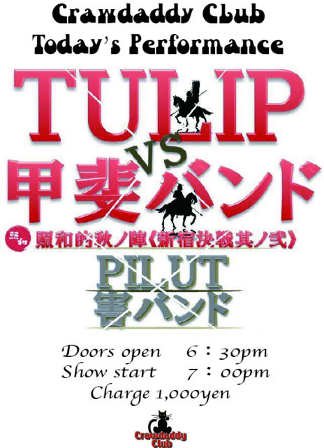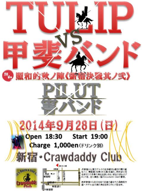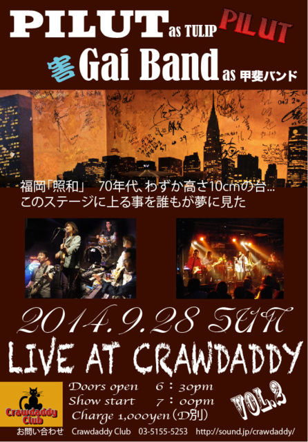 PILUT30¼þǯµÇ°¥é¥¤¥Ö¥Ä¥¢¡¼¤âÂèÏ»ÃÆ¤È¤Ê¤ê¤Þ¤·¤¿¡ª º£²ó¤Ï¡¢¶Ë¤áÊý¤¬¤Ï¤ó¤Ð¤Ê¤¤¥Û¥ó¥â¥Î¹ÃÈ夵¤ó¤òο²ï¤¹¤ë ¹ÃÈå¥Ð¥ó¥É¥³¥Ô¡¼¡Ö³²¥Ð¥ó¥É¡×¤µ¤ó¤È¤Î¶¥±é¤Ë¤Ê¤ê¤Þ¤¹¡ª 2014ǯ9·î28Æü(Æü) ¿·½ÉCrawdaddy Club¡Ê¥¯¥í¥¦¥À¥Ç¥£¡¦¥¯¥é¥Ö¡Ë ¡Ø¹ÃÈå¥Ð¥ó¥Évs¥Á¥å¡¼¥ê¥Ã¥×¡ª¡Ù¶å½£Âз衪¡ª ¡Ô³«¾ì¡Õ18:30 ¡Ô³«±é¡Õ19:00 ¡Ô½Ð±é¡ÕPILUT¡¡¡¿¡¡³²¥Ð¥ó¥É¡Ê¢¨PILUT¤Ï19:00¤è¤ê±éÁդǤ¹¡Ë ¡ÔÎÁ¶â¡Õ1000±ß(¥É¥ê¥ó¥¯ÊÌ) http://sound.jp/crawdaddy/main/main.html