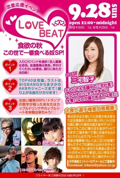 9·î28Æü¤Ï¡ùĶÏÃÂê¤Î¥¤¥Ù¥ó¥ÈLOVE BEAT¡Ê¥é¥Ö¥Ó¡¼¥È¡Ë¤¬½Â륥ã¥á¥í¥Ã¥È¤Ç³«ºÅ¤Ç¤¹¡ª ¤¼¤Ò¤ª±Û¤·¤¯¤À¤µ¤¤¡ù Ëè²ó»²²Ã¼Ô1000¿Í¤òͤ¨¡¢¹ë²Ú¥²¥¹¥È¤ä¥µ¥×¥é¥¤¥º¤â¤¢¤ê¤ªÁû¤¬¤»¤Ê¤³¤Î¥¤¥Ù¥ó¥È ¡ª º£²ó¤ÏÂç¿©¤¤Áª¼ê¸¢³«ºÅ¡ª Í¥¾¡¼Ô¡¢¤â¤·¤¯¤Ï2°Ì¤Ë¤Ï¹ë²Ú¾Þ¶â¡ª¥Æ¥ì¥Ó¤Ç³èÌöÃæ¤Î»°ÂðÃÒ»Ò¤¬GUEST¤ÇÅо졪¡ª ¤Ê¤ó¤ÈÅöÆü¤Ï¡ª½Â륥ã¥á¥í¥Ã¥È¤ÎÆþ¤ê¸ý¤Ç ¡ÖDJ¡¡MIYA¤Î¥²¥¹¥È¤Ç¥é¥ÖÃíÆþ¡ª¡× ¤È¸À¤Ã¤Æ¤¤¤¿¤À¤±¤ë¤À¤±¤Ç ¡ÚÆÃÊ̥ǥ£¥¹¥«¥¦¥ó¥È ²Á³Ê¡ÛÃËÀ2000/1D¡¢½÷À1500/1D¤Ç¤´¾·ÂÔ¤·¤Þ¤¹! ¡Ê²¿Ì¾ÍÍ¤Ç¤â¤´ÍøÍѲÄǽ¡ù