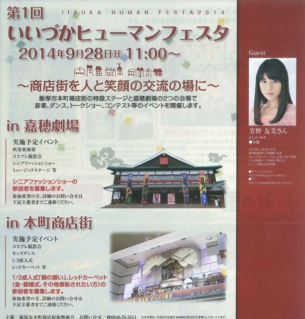 Âè1²ó¤¤¤¤¤Å¤«¥Ò¥å¡¼¥Þ¥ó¥Õ¥§¥¹¥¿ ¤Î¤ªÃΤ餻¤Ç¤¹¡£ ¡Á¾¦Å¹³¹¤ò¿Í¤È¾Ð´é¤Î¸òή¤Î¾ì¤Ë¡Á ÈÓÄÍ»ÔËÜÄ®¾¦Å¹³¹¤ÎÆÃÀߥ¹¥Æ¡¼¥¸¤È ²ÅÊæ·à¾ì¤Î£²¤Ä¤Î²ñ¾ì¤Ç¡¢ ²»³Ú¡¢¥À¥ó¥¹¡¢¥È¡¼¥¯¥·¥ç¡¼¡¢¥³¥ó¥Æ¥¹¥ÈÅù¤Î¥¤¥Ù¥ó¥È¤ò³«ºÅ¤·¤Þ¤¹¡£ ¥²¥¹¥È¤Ïº£ÏÃÂê¤Î¡Ö²Ö»Ò¤È¥¢¥ó¡×¤Ë½Ð±é¤µ¤ì¤Æ¤¤¤ë ÈÓÄͻԽпȤÎ˧ÌîͧÈþ¤µ¤ó¤Ç¤¹¡£ ¡ÚÆü»þ¡ÛÊ¿À®26ǯ9·î28Æü¡ÊÆü¡Ë11¡§00¡Á ¡Ú²ñ¾ì¡Û²ÅÊæ·à¾ì ¡ÊÈÓÄÍ»ÔÈÓÄÍ5¡Ý23¡Ë ¡¡¡¡¡¡¡¡ËÜÄ®¾¦Å¹³¹ ¡Ú¥¢¥¯¥»¥¹¡ÛÀ¾Å´¡ÖÈÓÄͥХ¹¥»¥ó¥¿¡¼¡×²¼¼Ö¡¡ÅÌÊâ10Ê¬ÄøÅÙ ¡Ú¤ªÌä¹ç¤»¡Û0948-25-3511