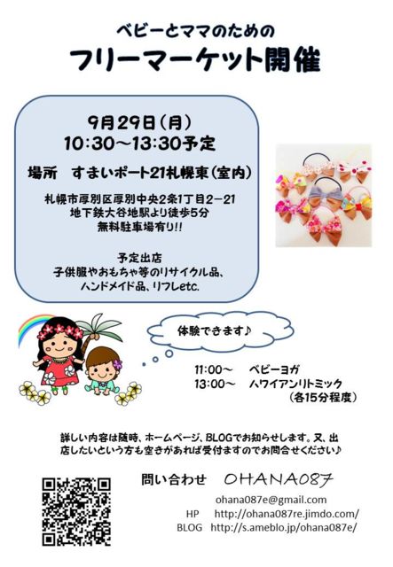 管理人様、貴重なスペースを利用させていただきありがとうございます。 こんにちは。 OHANA087の宮崎ともうします。 この度、ママとベビーの為のフリーマーケットを開催することになりました。 地下鉄大谷地駅の近くで、無料駐車場もあるのでぜひ気軽に遊びに来てくださいね。 日時 9月29日(月) 10時30分〜13時30分まで 場所 すまいポート21札幌東 札幌市厚別区厚別中央2条1丁目2−21 (地下鉄大谷地駅より徒歩5分 無料駐車場あり)