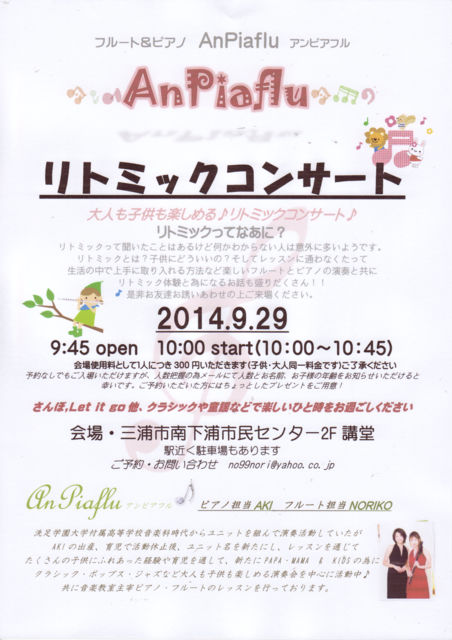 リトミックコンサートin 三浦海岸 南下浦市民センター2F 講堂 2014.9.29(月) 9:45開場 10時開演 リトミックって聞いたことあるけどなあに?から 日常生活にどう取り入れるの?まで楽しいフルートとピアノの演奏と共に リトミック体験とためになるお話も盛りだくさん! 駅から近くで駐車場もあります! お気軽に詳細お問い合わせ・ご予約などメッセージください(^^)