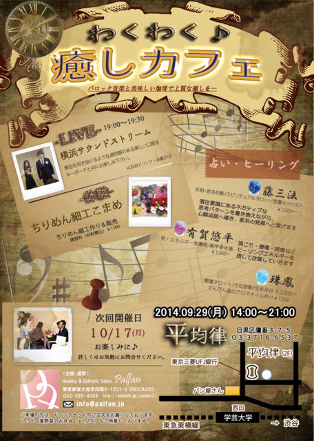 9月29日(月) 14:00〜21:00 占い・ヒーリングの ワークショップなど 癒しのイベントを開催します。 ご来場の方は イベント用お菓子ドリンクセット(¥1000) 1オーダーお願いいたします。
