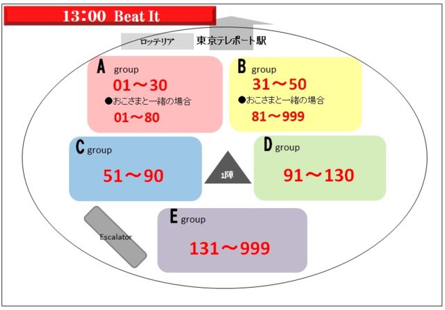 2014年6月22日(日)お台場でBeat It!! 〓〓〓〓〓〓〓〓〓〓〓〓〓〓 15:00 Beat It+EOフラッシュモブ 〓〓〓〓〓〓〓〓〓〓〓〓〓〓 フラッシュモブ参加エントリーのご案内です。 当トピックを最後までお読みいただいたうえで参加エントリーしてください。 ※お願い事項※ 配布物の数の用意や人数予測のために、お早めの参加表明にご協力ください。 (参加未定の方もとりあえずポチって、あとでキャンセルいただいてもOKです) ================================== ★2014.6.18 追記★写真3枚目にイメージ画像を貼ってま