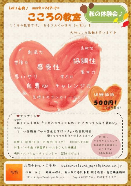 ♪こころの教室at北生駒 秋の体験会開催のお知らせ♪ お子さんの心育ちを応援しているmyrk*マイアーク*です。 最近よく、 「どういうことをする教室なんですか?」 「心の成長って具体的にどういうことですか?」 などなど、お問合わせをいただくことが増えました♪ ありがとうございます。 その都度ご説明させていただいていますが、お話だけでは 伝えきれない部分もあるのが正直なところ… そこで、たくさんの方に一度体験してほしい!という思いのもと、 10月、11月連続で、こころの教室 秋の体験会を開催いたします。 お